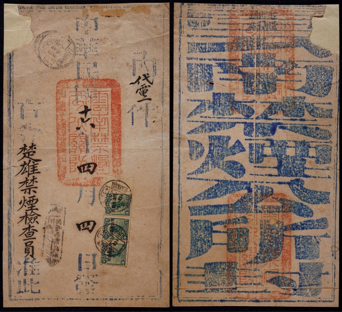 1927年云南府挂号寄楚雄禁烟公所公文封套,云南禁烟公所中式封,钤官印三方,正贴北京二版帆船“限滇省贴用”邮票3分横三连,邮资9分(信函4分+挂号5分),销云南府4月5日英汉腰框日戳,另盖R云南府挂号戳,落地楚雄1927年4月9日到达戳,封左上角小有修补,整体完整 ...