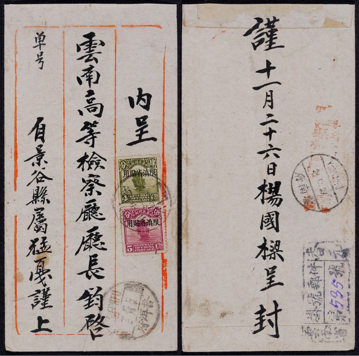 1927年云南永昌寄云南府双挂号红条封,背贴加盖“限滇省贴用”6分、8分各一枚,计符双挂号信函邮资14分,销永昌4月29日英汉三格日戳,正盖“AR”双挂号小圆戳、R云南永昌邮局第(1145)号手填挂号戳,落地云南府5月15日到达戳,带展页<br><br>那家佑著:“限滇省贴用”邮票与 ...