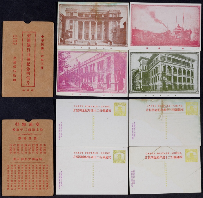 1927年交通银行20周年纪念邮资明信片未使用全套4枚,带封套,其中一枚有破损,其馀保存完好