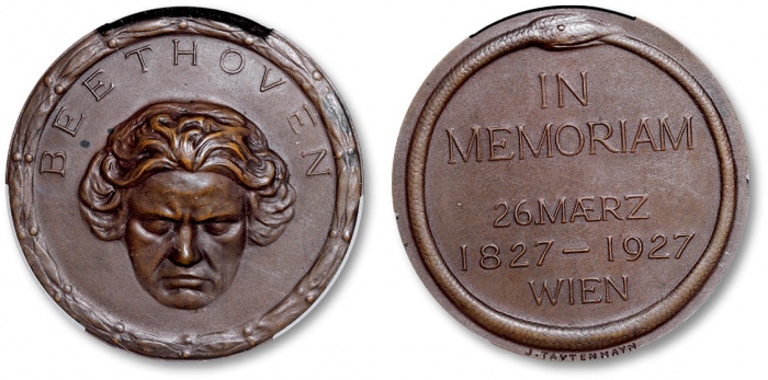 奥地利1927年“贝多芬逝世一百周年”纪念铜章一枚,高浮雕,工艺精美,金盾 PCGS SP64(86280316)