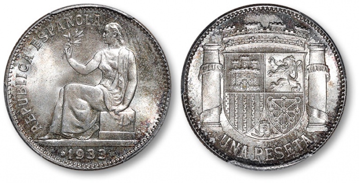 西班牙1933年1比赛塔银币一枚,打制规范深峻,浮雕感强烈,细节分明,原味欧洲五彩包浆,底光丝滑柔亮,状态一流,品相顶级,金盾PCGS MS66(80967560)为此公司此品种仅五枚之第一名分数