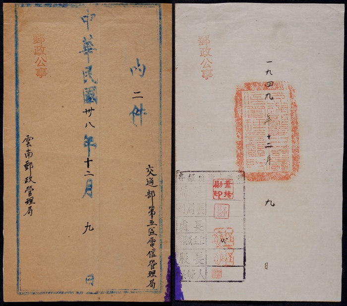 1949年云南邮政管理局邮政公事封实寄,钤官印一方,另盖各级负责人名章5枚,云南全省和平解放当天12月9日实用例,保存完好