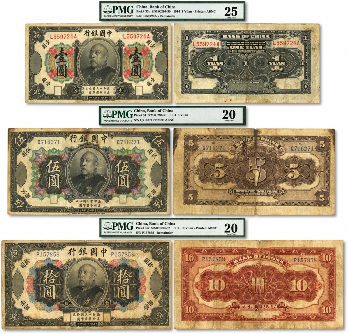 民国三年(1914年)中国银行袁世凯像壹圆、伍圆、拾圆共3枚,中国纸币之名誉品,少见,纸张纹理清晰,色彩浓郁自然,原汁原味,气质八成新