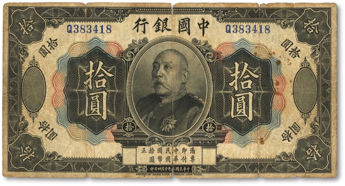 民国三年(1914年)中国银行袁世凯像拾圆,中国纸币之名誉品,少见,雕刻板纹路尚清晰,包浆醇厚,色彩浓郁,原汁原味,七五成新