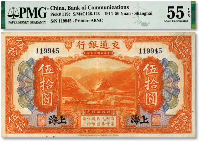 民国三年(1914年)交通银行伍拾圆,上海地名,无字轨,纸张硬挺,凹凸明显,色彩明丽,品相上佳,九成新