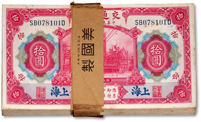 民国三年(1914年)交通银行红色拾圆共50枚连号,SA字轨,蓝黑色上海地名,较少见,纸张硬挺,雕刻版纹路清晰,色彩浓郁纯正,自然波浪起伏,状态极佳,全新