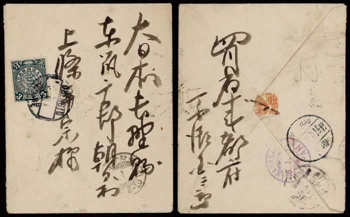 1910年四川成都寄日本封,贴蟠龙3分一枚,销成都庚戌英汉腰框式干支日戳,有上海1月20日汉英半切小圆戳中转,进口日本1月23日转日本长崎到戳,片上另盖“成都文庙后街第分局”三格手填戳较少见,保存完好 ...