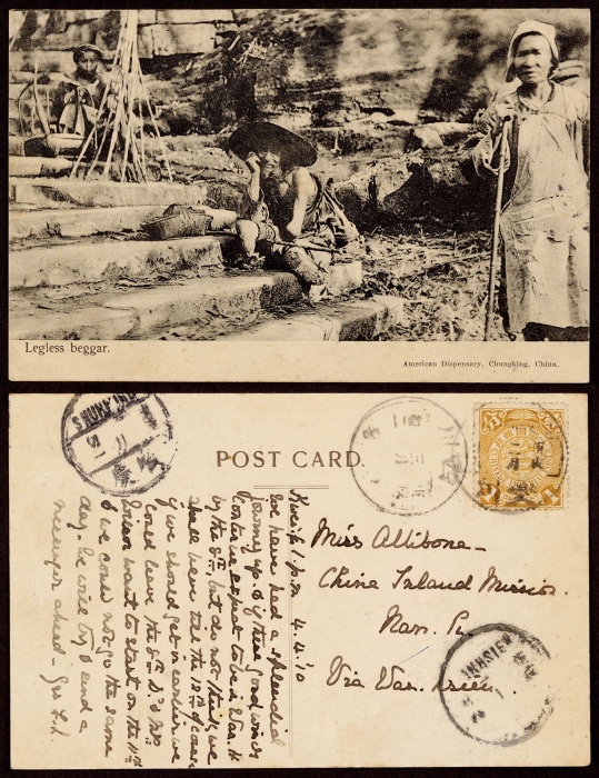 1910年四川夔府寄西川南部明信片,贴蟠龙1分一枚,销夔府庚戌二月廿八英汉腰框干支日戳,另分盖有万县二月廿八、重庆庚戌三月初一、西川南部庚戌三月初二到达戳戳,片背图:生活在山区的一家三口人 ...