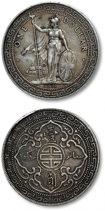 1911年香港不列颠尼亚女神站像壹圆银币一枚,整体清晰,醇厚灰色老包浆,状态自然,金盾PCGS XF Detail(87121438)
