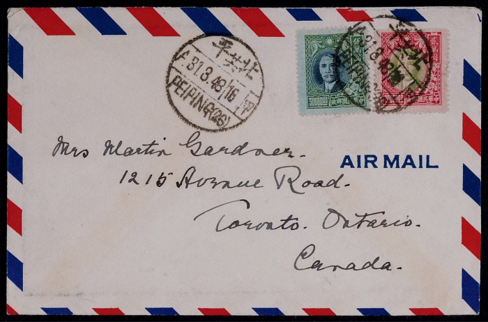 1948年北平寄加拿大调资尾日封,贴梅花版孙中山像2万元及5万元各一枚,合符平信航空邮资,销北平3.31英汉戳,(1948.03.16-03.31)之15天邮资段的尾日邮资使用,保存完好