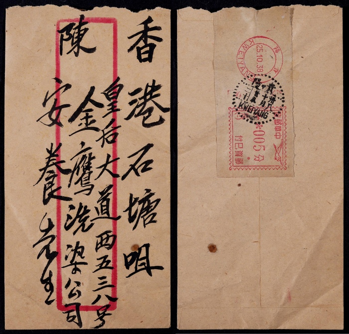 1949年贵阳寄香港银元平信封,中式封背贴“贵阳38.10.25中华邮政筑(二)底头飞雁图005分邮资已付”邮资机券一枚,并手盖贵阳(甲)10月28日汉英三格点线日戳,注:贵阳市于1949.11.4解放,封品完好 ...
