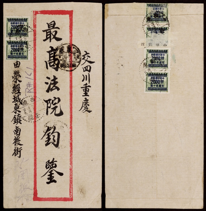 1949年西康荣经寄重庆双挂号封,红框封正背贴大业凹版印花税票改作“金元”邮票2000元共六枚,计邮资12000元(信函1500元+挂号4500元+回执6000元),销西康荣经4月29日戳,有重庆5月3日到达戳,此封寄发当天中华邮政启用银元(基数)邮资,西康地区仍依照金元邮资计费,邮史研 ...