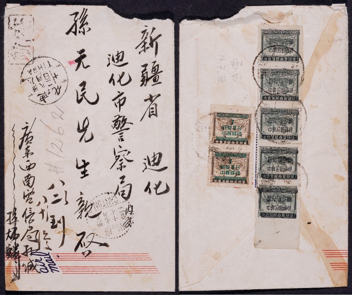 1949年广东西南电信局寄新疆迪化航挂银圆封,背贴印花税票改作银圆邮票1分两枚,改作“国内信函费”单位邮票五枚,销西南七月十六英汉腰框日戳,另盖“航空”邮政副戳,手写挂号#1262,有广州七月十七日中转戳,落地迪化八月二日到戳,较少见华南寄西北地区银圆封,保存完好 ...
