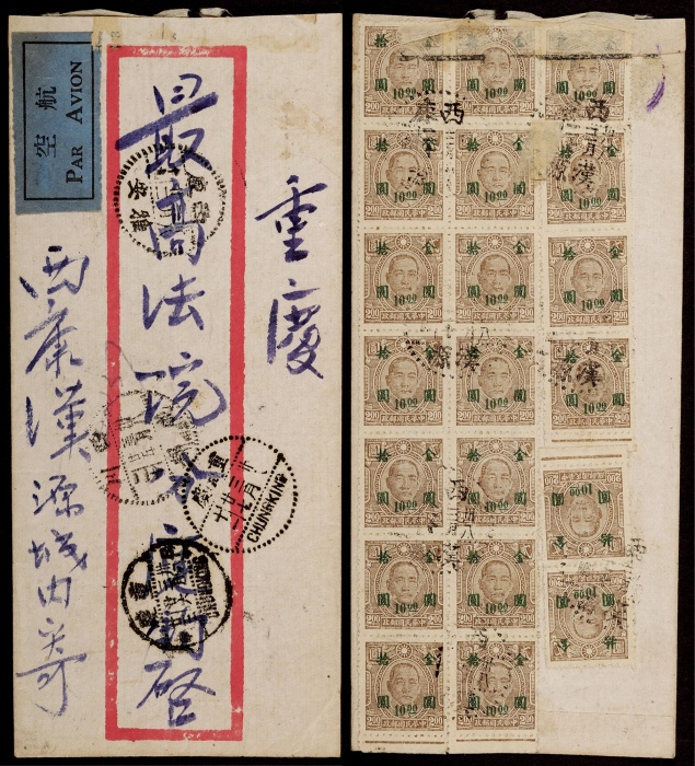 1949年西康汉源寄南京转寄重庆双挂号航空金元封,红框封背叠贴孙中山像金元改值10元三十枚(重庆中央版),5元六枚(上海大东二版),计邮资330元(信函25元+航空45元+挂号80元+回执180元),销西康汉源3月7日发戳,落地南京3月17日到戳,此封航空转寄重庆,有1949年3月18日重 ...