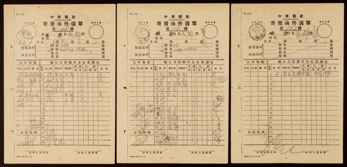 1949年中华邮政寄发函件清单实用一组3件,分盖西康雅安卅八年四月(十二日、十四日、十六日)三格点线日戳发成都,邮政存档,1949年四川解放后节约利用,各单背书写不同内容,保存完好,请预览 ...