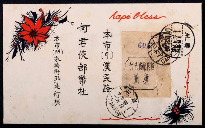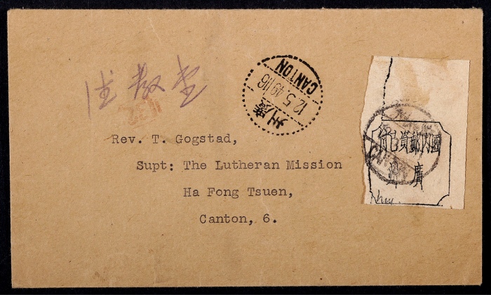 1949年广州寄本埠银圆封,贴“广州国内邮资已付”方型凹角戳油印邮资券一枚,销广州49.5.21汉英三格日戳,落广州同日到达戳,民国银圆短暂邮史研究组集较好素材,保存完好
