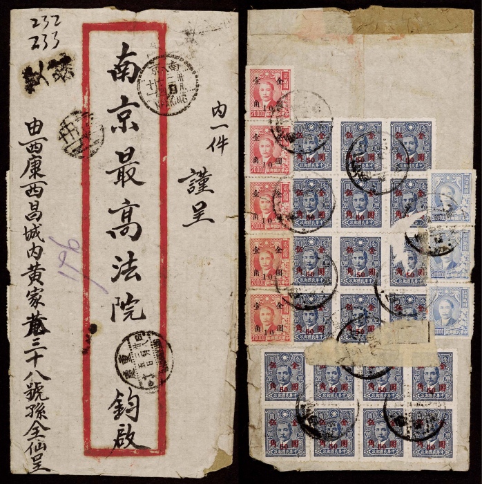 1949年西川西昌寄南京双挂号封,贴孙中山像法币梅花版500万元三枚(1500万折合金元5元)、金元改值1角五枚、5角二十枚,合计金元邮资15.50元,销西昌二月廿四日左读款式日戳(少见),另盖“双挂”邮政副戳,有重庆中转及南京到达戳,最高面值国币邮票及金元邮票混贴较少见, ...