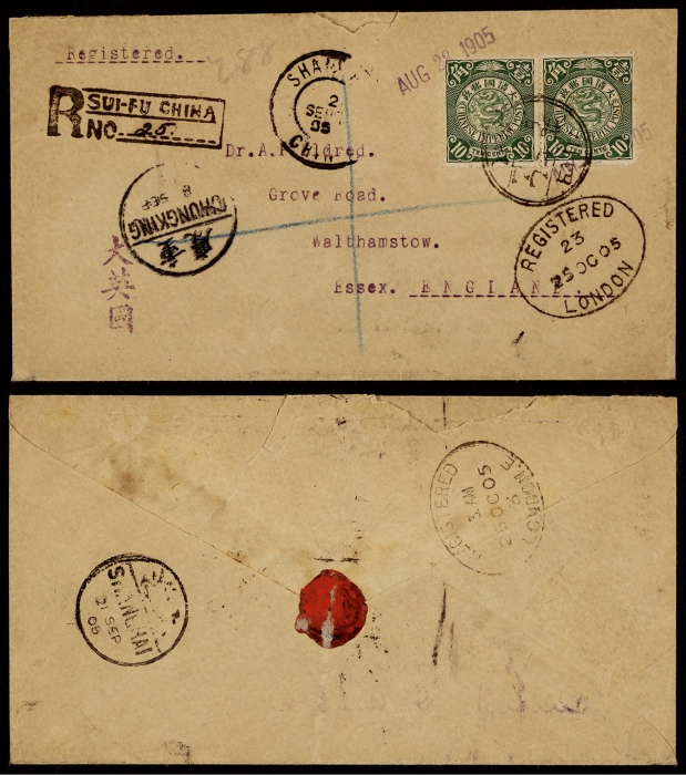 1905年四川叙府寄英国挂号封,贴蟠龙10分双连,计符邮资20分,销四川叙府乙巳七月廿九日双圈小三格干支日戳,另盖“R叙府中国NO(25)”英文挂号戳,经重庆9月8日、上海9月21-上海法国客邮同日中转出口,到达英国伦敦10月25日转-10月26日各一枚,保存完好 ...