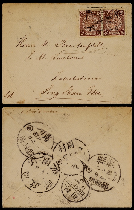 1902年汉口寄南京双挂号封,西式封贴蟠龙10分、1分各一枚,合符平信双挂号邮资11分,分销“R”及汉口11月18日汉英半切小圆日戳,另盖汉口英文挂号(2728)戳,背落南京11月20日到达戳,信封上边有修补,保存较好 ...