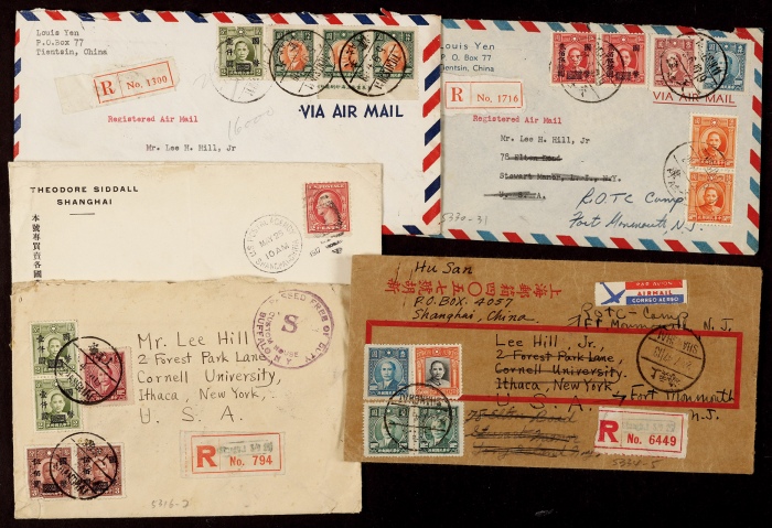 民国著名集邮家实寄封一组5件:1947年上海胡新寄美国挂号封2件;1947年香港集邮家严西峤天津寄上海2件;1917年美籍邮商薛多尔封。保存完好