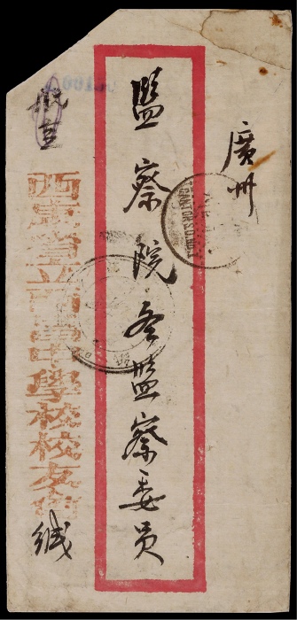 1947年西康西昌寄广州新闻纸资费已付封,剪角印刷品红框封,由西昌中学发广州,盖“新闻纸资费已付 西康西昌七月十九”双圈日戳,落地广州七月到戳,少见西南区西昌新闻纸资费已付戳实用例,保存较好带展页 ...