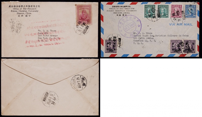 1947年福建鼓山寄美国封2件:平信封贴蒋介石六秩寿辰300元,销鼓山1月16日汉英三格点线日戳;航空封贴孙中山像上海大东一版500元两枚、1000元及3000元各一枚、伦敦版国币改值100元三枚,邮资计5300元,销鼓山7月18日发戳,另盖上海7月22日中美直达航邮纪念戳中转,保存完好 ...