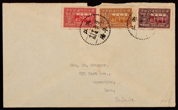 1947年浙江平阳寄美国封,贴民国政府还都纪念250元、350元、400元各一枚,销浙江平阳五月十七点线三格日戳,国际平信邮资1100元,此封贴票计1000元,但邮政疏忽未作欠资处理,保存较好