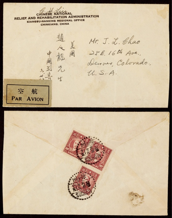 1947年徐州寄美国集邮家赵人龙封,西式封背贴上海大东一版孙中山像1000元三枚,计邮资3000元,销徐州6月28日小三格点线日戳,封品完好<br><br>赵人龙(1918.3-2014.12),江苏常熟人,民国著名教育家,国学大师赵欲仁长子,公认的集邮界泰斗级人物,1930年开始集邮,为解放前 ...