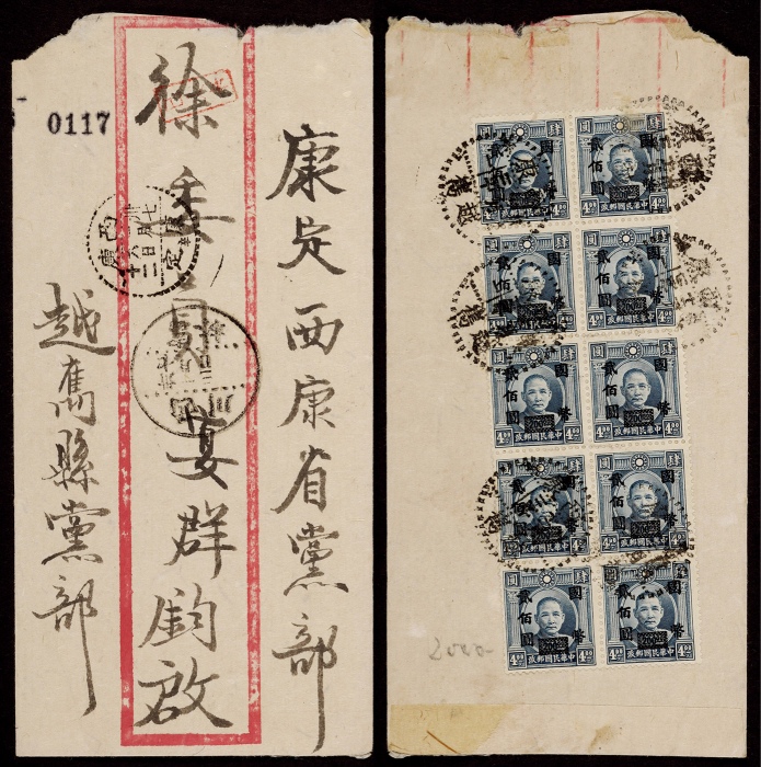 1947年西康越巂寄康定印刷品挂号封,贴伦敦版孙中山像国币改值200元十方连,计符邮资4000元(印刷品1000元+挂号3000元),销西康越巂12月30日戳,经西川富林1948年1月3日中转,落地西康康定1月6日到达戳,邮政信息完整,西康地区印刷品挂号实例较少见,保存完好 ...