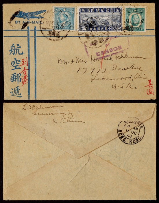 1941年长沙寄美国航空改退检查封,贴孙中山像50分、航空邮票25分各一枚,销湖南长沙五月九日发戳,经桂林5月12日、香港5月15日中转,七日因地址有误无法投递,盖美国纽约1941年7月7日戳退回长沙,邮路经大西洋、印度洋-缅甸仰光,贴检查重封条并盖检查戳,进口云南中转,返落 ...
