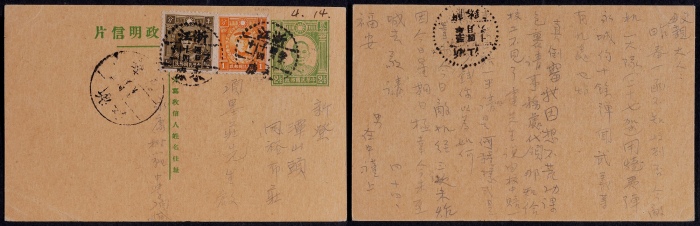 1941年孙中山像2分半邮资片浙江永康寄新登,加贴烈士像半分、1分各一枚,销浙江永康四月十四戳,浙江兰溪四月十六中转戳,落浙江新登四月十九戳,邮路清晰,片品较好