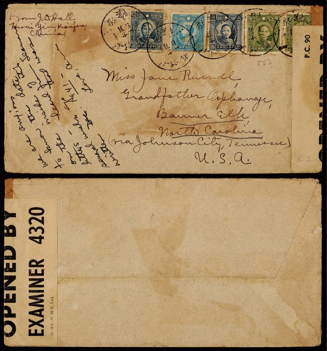 1941年江苏淮阴寄美国检查封,西式封贴孙中山像香港版50分一枚、5分两枚、伦敦版孙像20分及烈士像20分各一枚,计符国际平信邮资1元,销江苏淮阴12月1日全汉三格式日戳发出,封经香港中转并开口检查,贴4320编号检查重封条,封品完好 ...