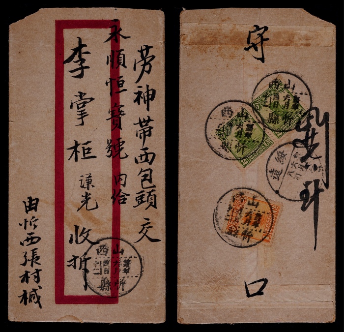 1934年绥远萨拉齐寄忻县红框封,贴伦敦版孙像单圈5分一枚,销绥远萨拉齐三月廿三日三格外圆实线内点线式日戳,落地山西忻县3月27日到戳,双戳清,封品完好,带展页