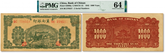 民国三十一年(1942年)冀南银行绿色火车图壹千圆,双号码券,纸张硬挺,凹凸明显,色彩浓郁,极为难得之顶级品相,凤毛麟角,全新(唯一冠军分)
