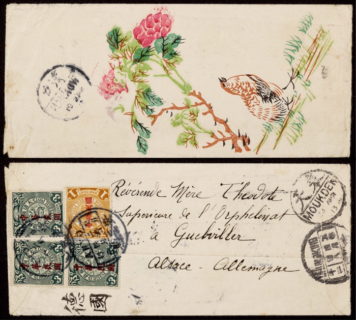 1913年四川安岳寄德国中式美术封,花鸟彩图中式美术封,背书写英文西式横用,贴蟠龙加盖“中华民国”红字楷体3分三枚及宋体红字1分一枚,计邮资10分,销安岳县二年四月初二英汉腰框日戳,中转盖重庆四月初八、汉口年4月18日各一枚,经西伯利亚邮路发德国,另盖有奉天4月23日转 ...