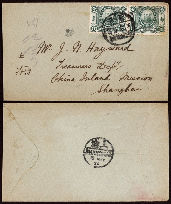 1913年四川重庆寄上海超重封,贴共和纪念3分两枚,计邮资6分(国内平信3分+续重3分),销重庆二年三月十九日英汉腰日戳,背落盖上海3月15日汉英半切小圆日戳,民国共和纪念邮票较好贴用实例,保存完好 ...