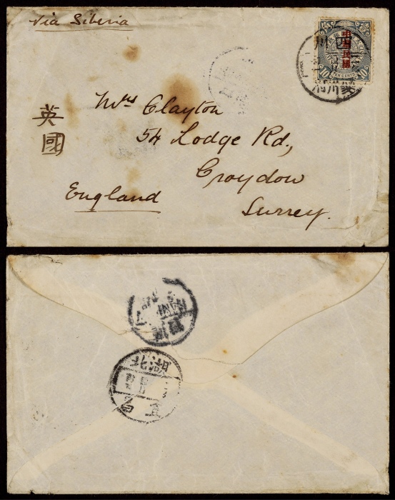 1913年四川夔州府寄英国封,西式平信封贴蟠龙加盖宋字“中华民国”10分一枚,销四川夔州府四月初一全汉腰框干支日戳寄,背分盖湖北宜昌四月初四及汉口中转戳各一枚,封显陈旧,完整无损