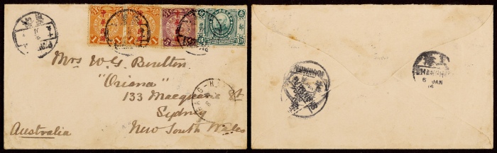 1913年四川保宁寄澳大利亚封,贴共和纪念3分一枚,蟠龙楷字加盖“中华民国”5分一枚、1分两枚、国际平信邮资10分,销保宁十二月十九英汉腰框日戳,背盖万县十二月廿六、上海1914年1月5日-上海英国客邮1月6日中转出口,保存完好 ...