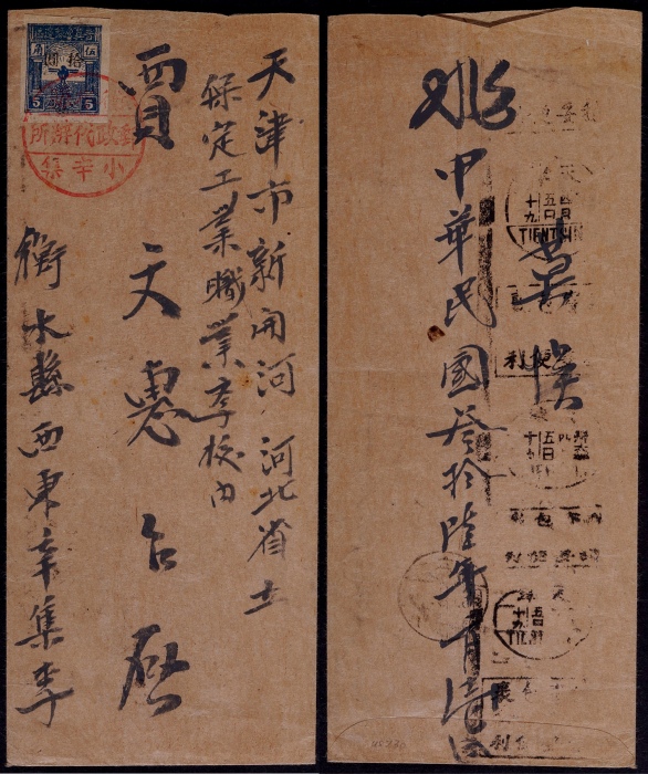 华北区1947年小辛集发天津中式封,正贴晋冀鲁豫边区鹰球图5元改10元邮票一枚,销“衡水县小辛集邮政代办所”三格红色戳,背分盖晋察冀衡水3月30日中转戳,落地机盖天津4月5日邮务宣传到戳。盖邮政代办所销票华北区封极少见,保存较好 ...