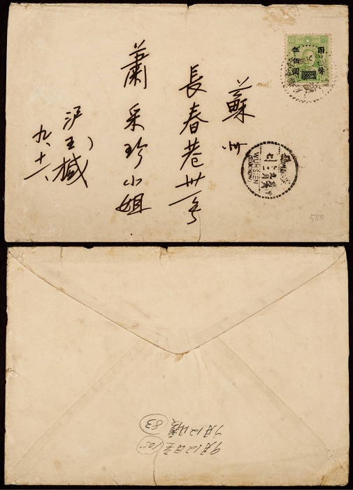 1947年上海寄苏州火车邮局封,贴伦敦版孙中山像国币改值500元一枚,销京沪铁路行动邮局(二)九月十二“沪京”三格点线日戳,落地盖吴县(苏州)9月12日汉英双地名日戳到达,火车邮史研究组集较好素材,保存完好 ...