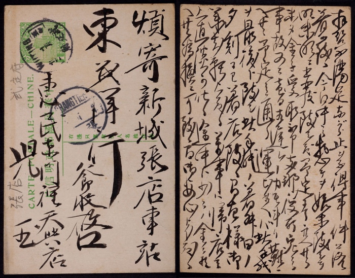 1916年第二版帆船1分邮资片山东武定府寄张店,销武定府十一月十二英汉腰框戳,另盖张店到达戳,全片中文毛笔书写,保存较好