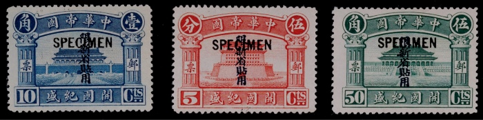 1916年开国纪盛加盖“限新省贴用”样票全套3枚,无胶轻贴,上中品