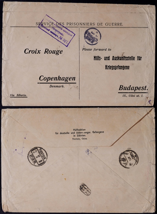 1916年天津寄丹麦大型检查封,天津战俘营寄出,背分盖天津府五年四月八日英汉腰日戳、天津同日英汉腰框式“D”型日戳各一枚,经满洲里9月12日汉英半切小圆戳中转,经西伯利亚邮路发丹麦,封上并盖俄文NO.527号紫色检查戳,封品完好 ...