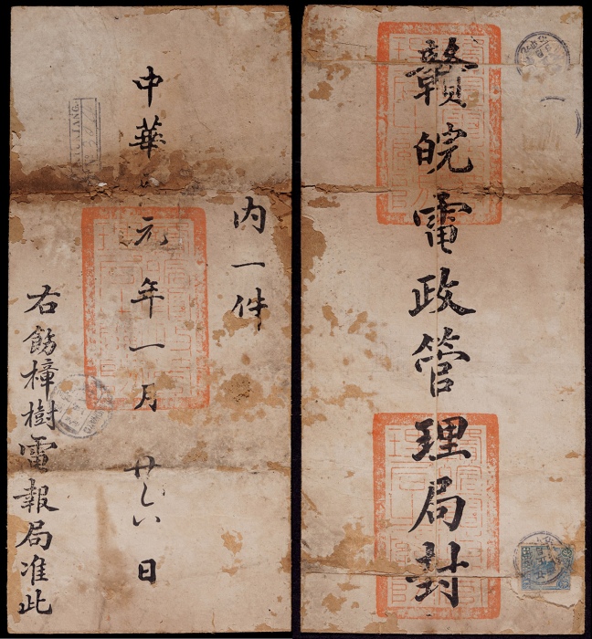 1916年(洪宪元年)江西九江寄樟树挂号公文封,赣皖电政管理局公文封,钤官印三方,贴北京一版帆船3分等三枚票(失落二枚),销江西九江(甲)元年正月廿六日双圈小三格日戳发,另盖R九江NO.3064全英文挂号手填戳,有南昌市元年正月廿八英汉腰框日戳中转,保存较好,少见品 ...