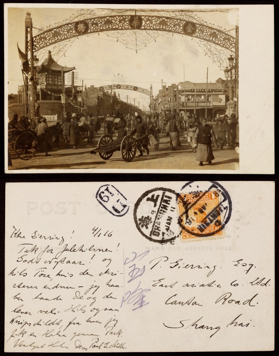 1916年(洪宪元年)天津寄上海“大胡同”照片明片,贴北京一版帆船1分一枚,销天津1月8日英汉腰框式“D”型日戳,另盖“D19”小戳,有上海1916年1月11日英汉半切小圆日戳到达,洪宪时期实寄片,片品完好 ...