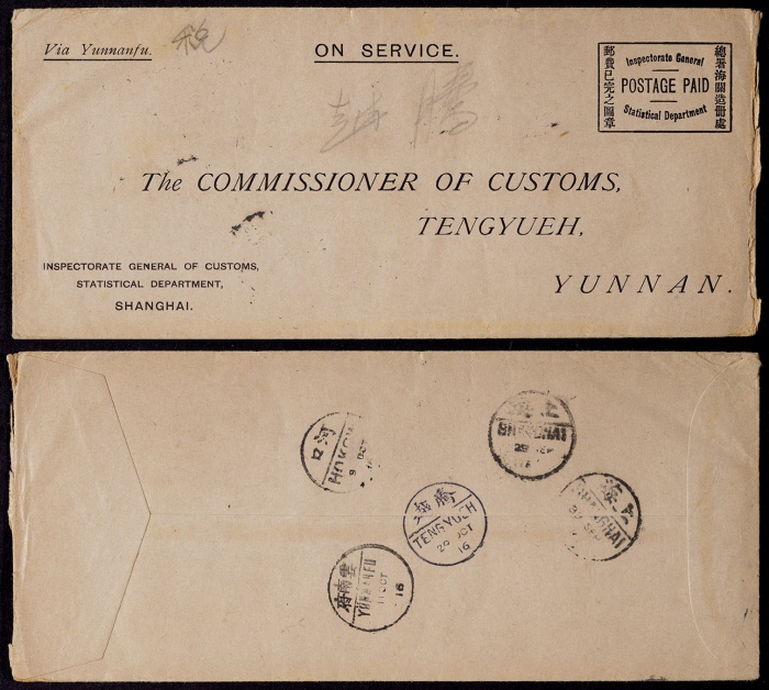1916年上海寄腾越公文封,机印“总署海关造册处,邮资已付完之图章”中英文免资戳公事封,背分盖上海9月29日-9月30日汉英半切小圆日戳各一枚,经河口10月9日-云南府10月11日中转,落地腾越10月20日到戳,邮程历时22天,此封极晚使用少见,保存完好 ...