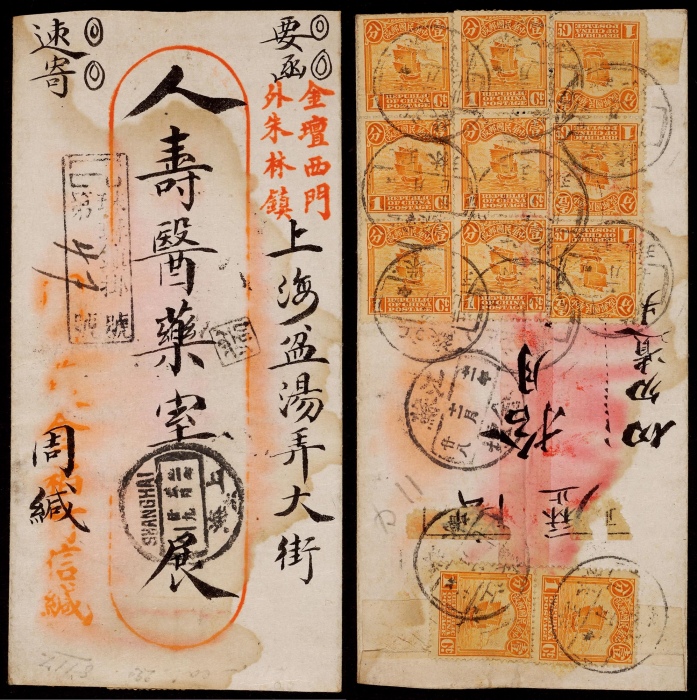 1922年江苏珠琳寄上海双挂快印刷品封,中式封背贴北京一版帆船1分十一枚,计符邮资11分(印刷品1分+挂快10分)销江苏珠琳十一月廿七全汉腰框日戳,并盖“R珠琳镇挂号第47号”中式挂号手填戳,经江苏金堰十一月廿八中转,落地上海十一月廿九到达戳,封毛笔注:密函、速寄,另盖 ...