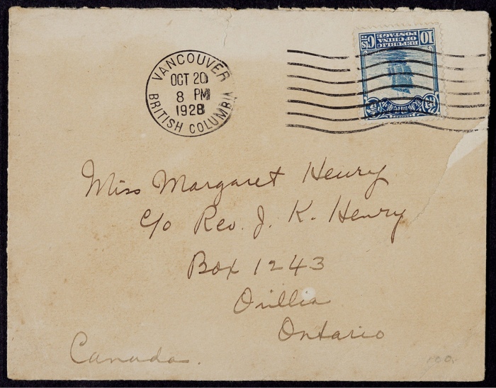 1928年中国寄加拿大船邮封,贴北京二版帆船10分一枚,国际水陆路邮资,机盖10月20日轮船波纹七线日戳,封品完好