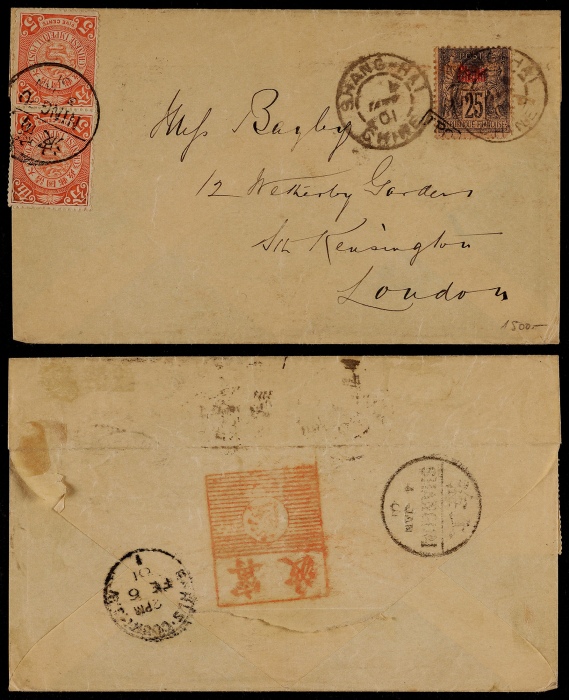 1901年浙江宁波寄英国伦敦平信封,贴蟠龙5分直双连、国际平信邮资10分,销宁波1月3日汉英半切小圆戳,经上海1月4日-上海法国客邮贴加盖“Chine”25生丁一枚,销同日戳中转出口,有英国2月6日到戳,封上另盖“宁波 陆”号信柜碑型红色戳少见,保存完好<br><br>浙江邮政史 10849 ...
