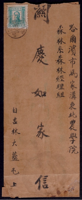 东北区1949年吉林寄哈尔滨平信封,中式封正贴东北第五版毛泽东像1500元一枚,销吉林10月21日戳,邮资相符,单戳较清,保存完整